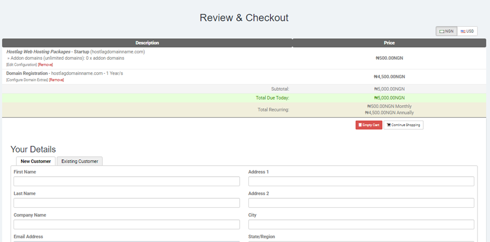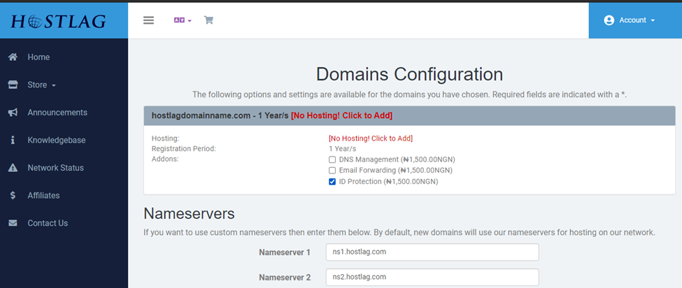 The next thing is the nameservers section, the default namesevers are ns1.hostlag.com and ns2.hostlag.com. You can leave it that way if you will be hosting your website on Hostlag, however, if you plan to host your website somewhere else, you may have to change the nameservers to the nameserver of your host.