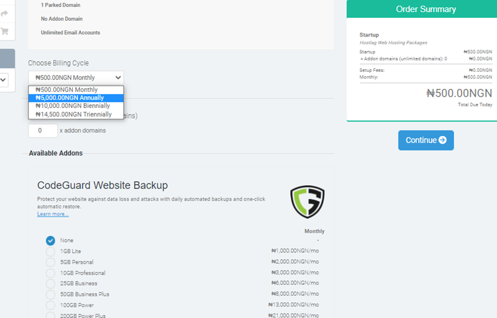 Once you selected your desired hosting plan the next stage is the configuration, this is where you select your billing circle and what kind of website backup you want, if you want any at all.