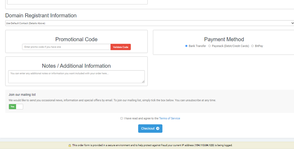 Fill in your correct details, check the checkbox that says “I have read and agree to the Terms of Service” and then proceed to checkout and pay, once check out is complete you’ll be issued a ticket, your domain and hosting will be activated on confirmation of payment.